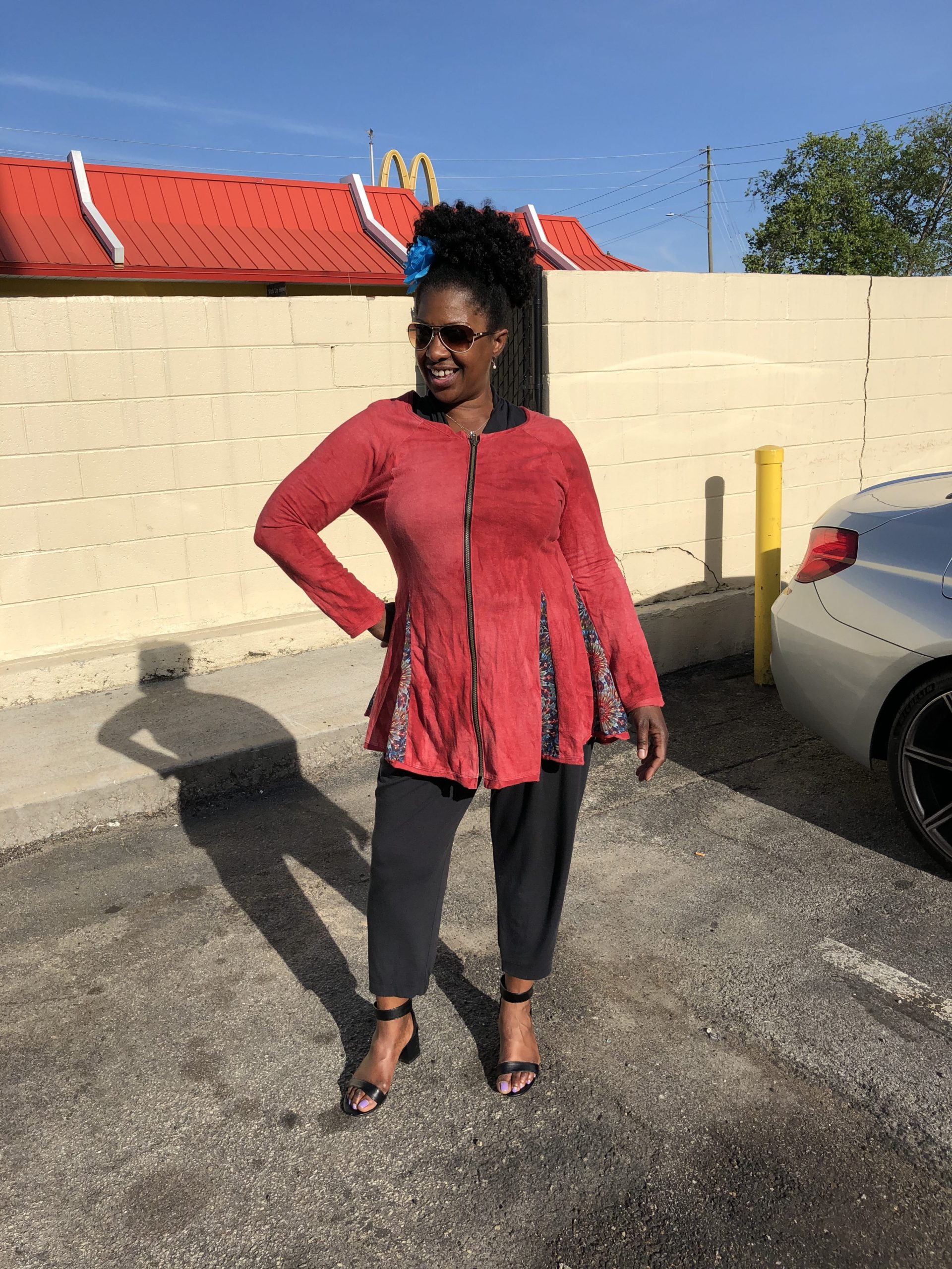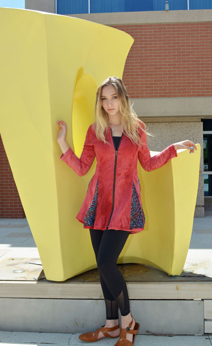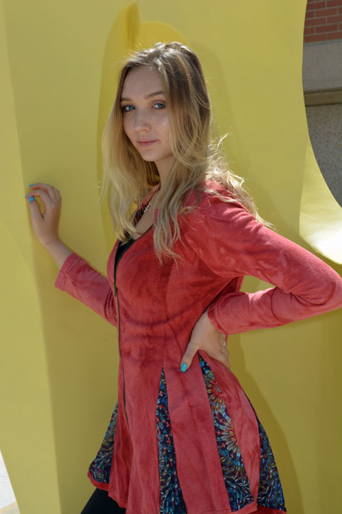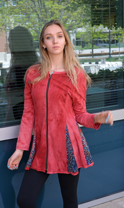 Our Jacket Dress is versatile and durable. Wear it over layers or as a dress! Designed by Leilani Henry. Â Made in Colorado with low impact hand-dyed hemp and organic cotton. This soft, plush fabric looks like suede. Â Push up the sleeves, leave the brass zipper open or zipped. This garment has a touch of sheer kaleidoscope fabric, in triangles, that makes it look like a skirt. Â You’ll find the flare bottom flattering for all body types. Â Pair it with matching leggings or a legging with a competing pattern!